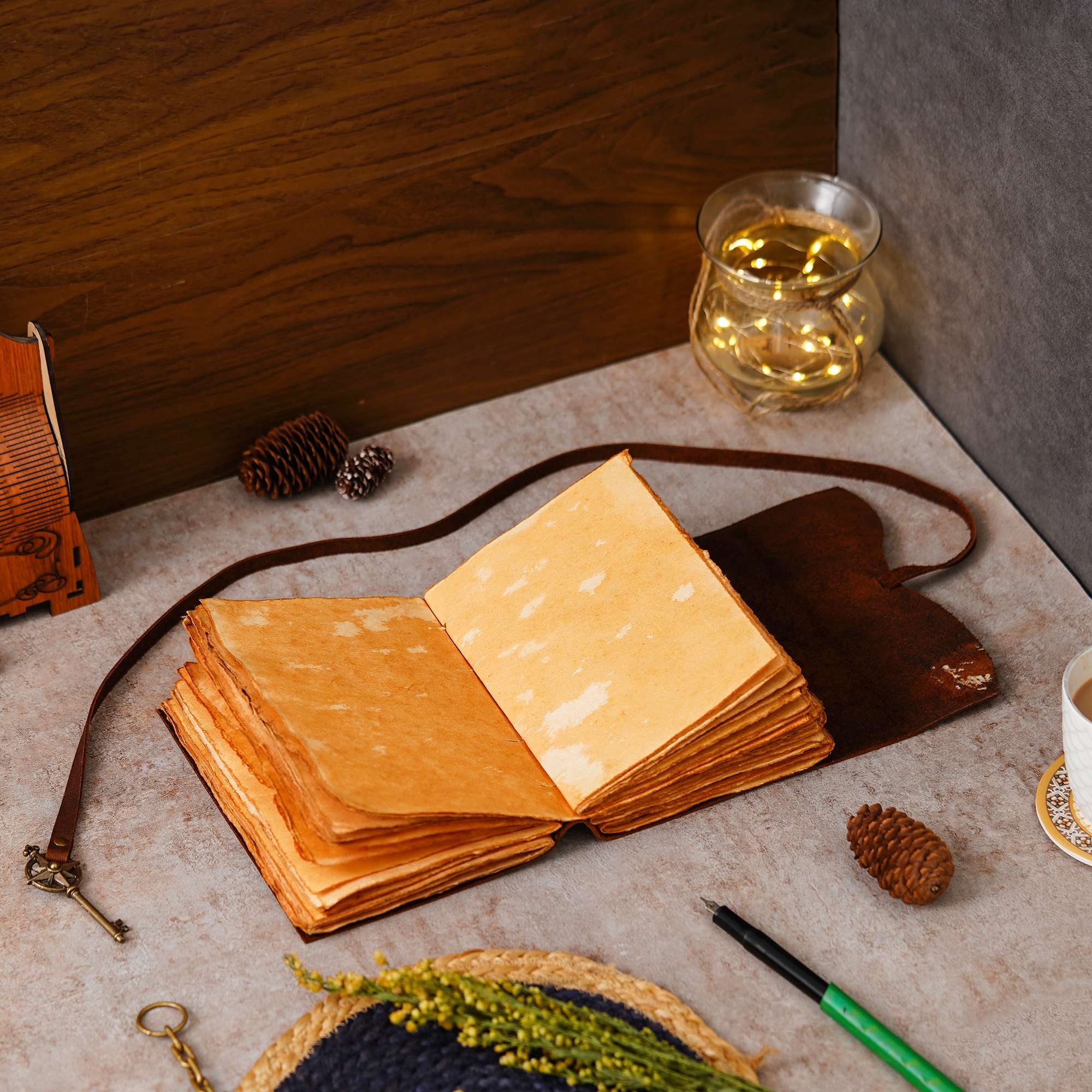 Capture your thoughts and memories in style with this exquisite handmade leather journal. Crafted from genuine leather, it emanates an authentic vintage charm, perfect for those who appreciate the finer things in life. The premium antique key design string closure adds a touch of sophistication, ensuring your journal stays securely closed when not in use. Inside, you’ll find 200 brown handmade pages, providing ample space for your creative expressions, sketches, notes, and musings. Whether you’re a writer, artist, or simply someone who enjoys the tactile experience of putting pen to paper, this journal is sure to become your cherished companion. Give the gift of inspiration to yourself or a loved one with this timeless piece that celebrates the art of handwritten expression