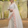 Women's Pristine White Organza Saree with Exquisite Pink & Green Floral Thread Embroidery – Complete with Matching Embroidered Blouse for Festive & Summer WearWomen’s Pristine White Organza Saree with Exquisite Pink & Green Floral Thread Embroidery – Complete with Matching Embroidered Blouse for Festive & Summer Wear