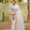Women's Pristine White Organza Saree with Exquisite Pink & Green Floral Thread Embroidery – Complete with Matching Embroidered Blouse for Festive & Summer WearWomen’s Pristine White Organza Saree with Exquisite Pink & Green Floral Thread Embroidery – Complete with Matching Embroidered Blouse for Festive & Summer Wear