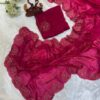 Women’s Elegant White Organza Saree with Hand-Painted Pink Rose Floral Print – Complete with Matching Blouse for Day & Festive Wear
